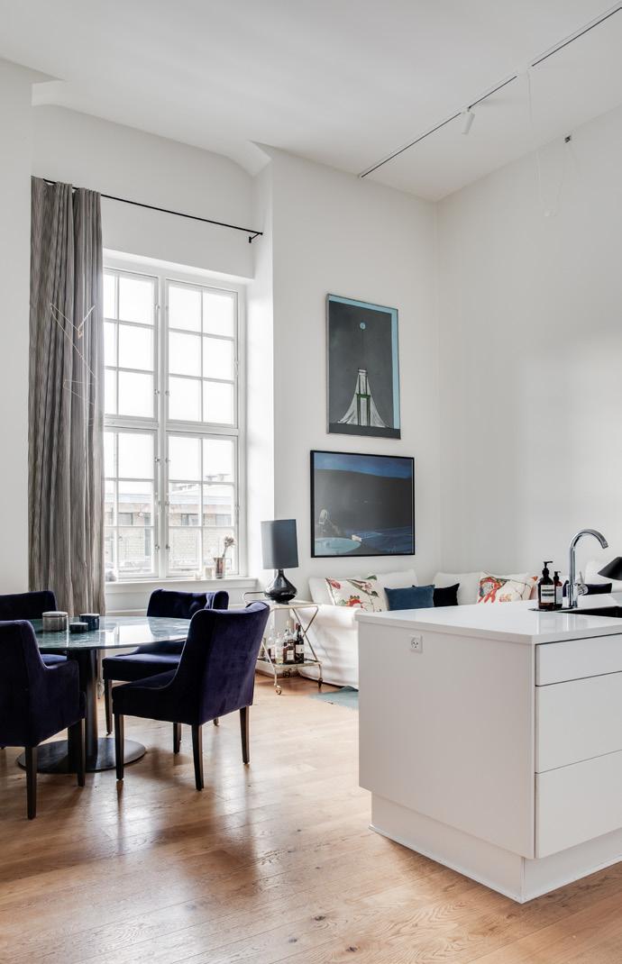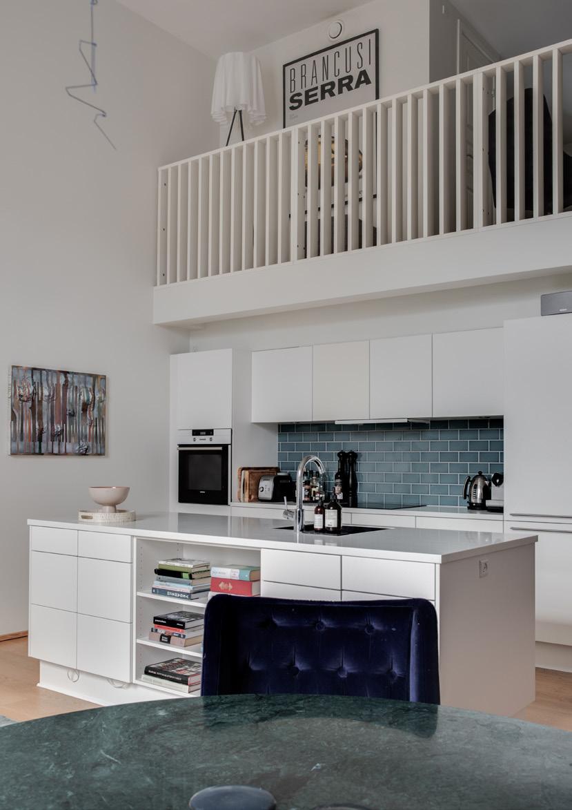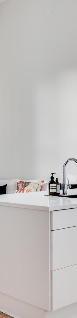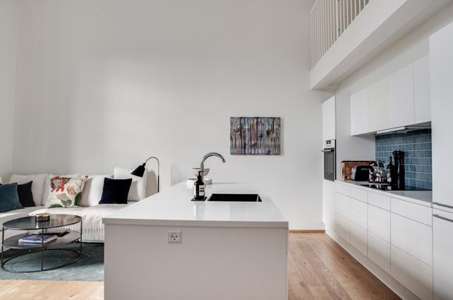 Køkkenet bekræfter lejlighedens høje standard af kvalitet og design. Det er istandsat med et flot skræddersyet JKE køkken som med sine rene hvide linjer integrerer smukt ind i rummets miljø.