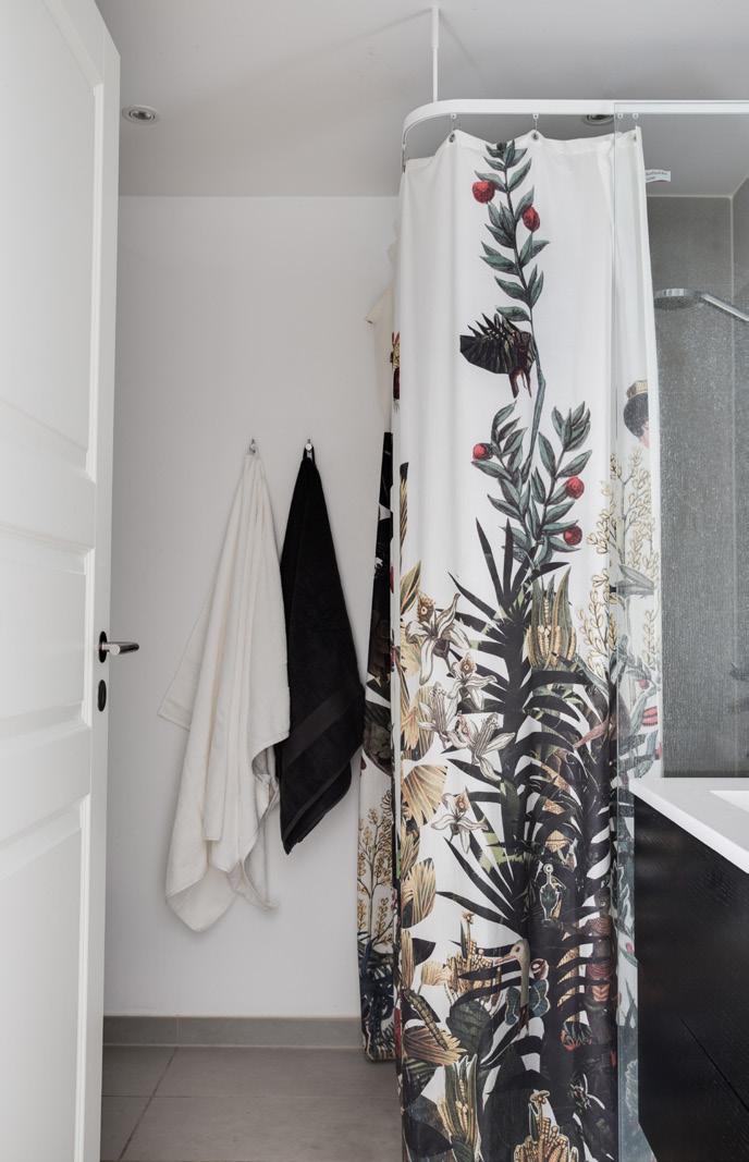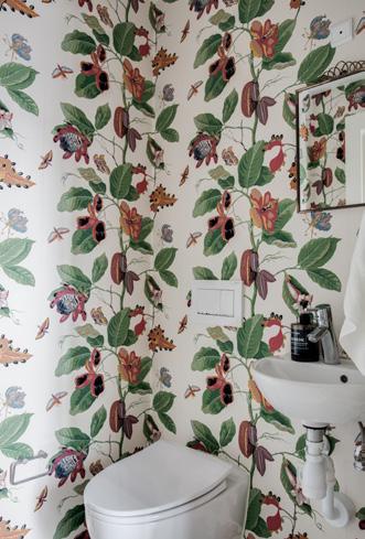 Ved enden ad gangen, tæt på soveværelserne, finder du lejlighedens badeværelse og gæstetoilet. I badeværelset kan du nyde store granitgrå fliser med gulvvarme, en rummelig bruseniche, stilren indretning, et væghængt toilet, og en vaskesøjle. Gæstetoilettet spreder glæde med en flot tapet med farverige blomster.