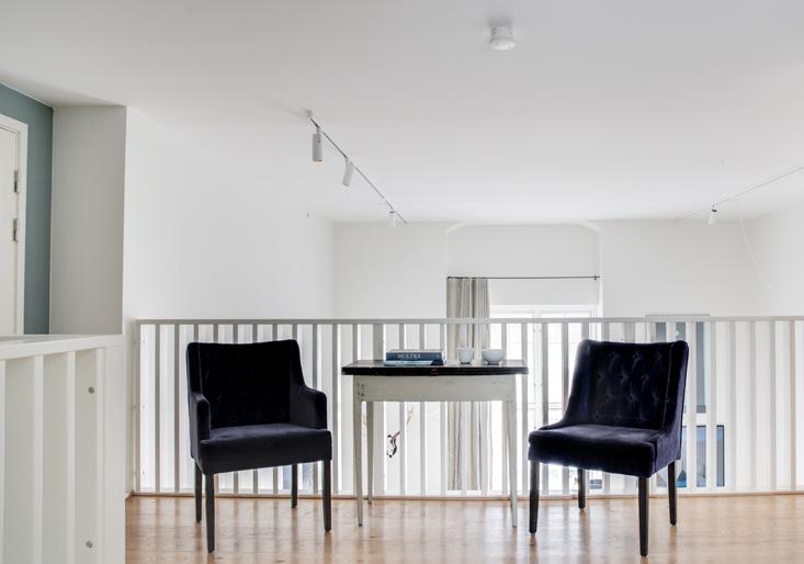 Som en flirt med ejendommens historie af skjulte etager og hjemlige rum, har man bevaret mystikken med en mezzaninetage. Fra entréen tager du trappen op til et meget hyggeligt rum med udsigt over den nederste etage. Her kan du enten vælge at arbejde uforstyrret, eller bruge det som et gemmested med tid fordybelse.