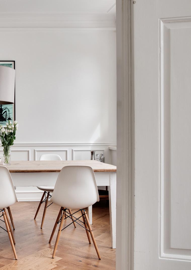 Gennem de høje franske døre går du videre ind til spisestuen, hvor vægpaneler, sildebensparket, og stuk, kompletterer ejendommens historie på bedste vis.