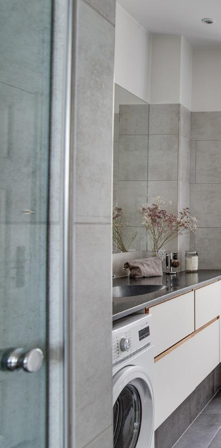 Med indgang fra både stuen og kontoret, er badeværelset et rum du altid har nem adgang til. Det er et skønt og kæmpestort badeværelse med naturligt lys fra vinduet mod gården. Indretningen er tidløs og med fokus på bekvemmelighed udover det sædvanlige.