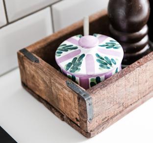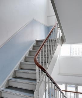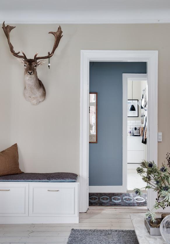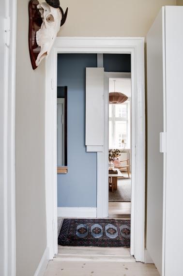 I entréen mødes du af lejlighedens dejlige og varme atmosfære. Væggene i entréen og fordelingsgangen er malet i en sart blågrå vægfarve. Det bevidste farvevalg er noget der følger dig videre ind til de smukt istandsatte værelser. Du vil blandt andet også opleve en varm gulbeige vægfarve, der forstærker hjemmets herskabelige og originale træk.