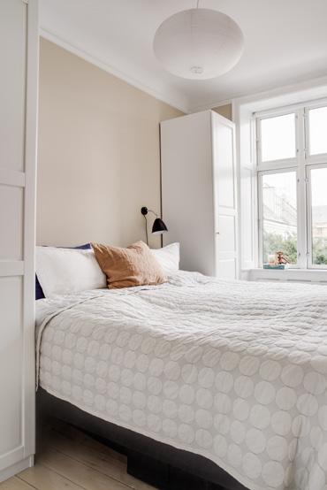 Dette nydelige soveværelse er et behageligt rum med et stort vindue der vender ud til baggården.