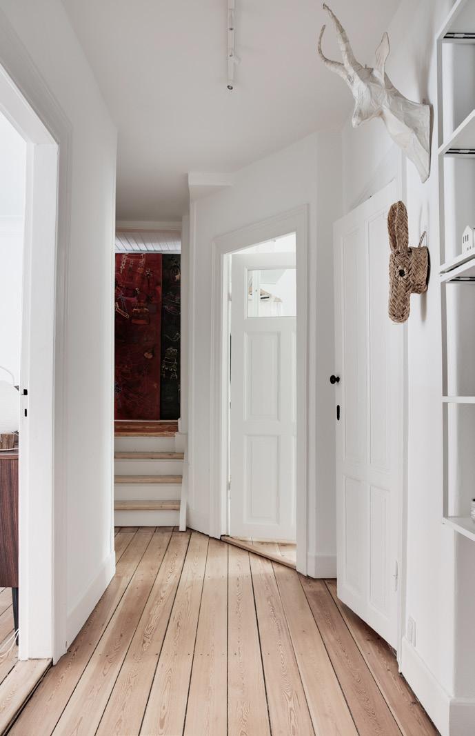 En særlig entré og gang, hvor du kan nå alle lejlighedens værelser. Ved enden ad gangen, går du tre trin op, til to af soveværelserne.