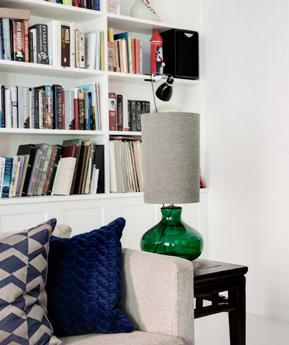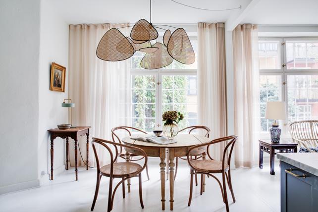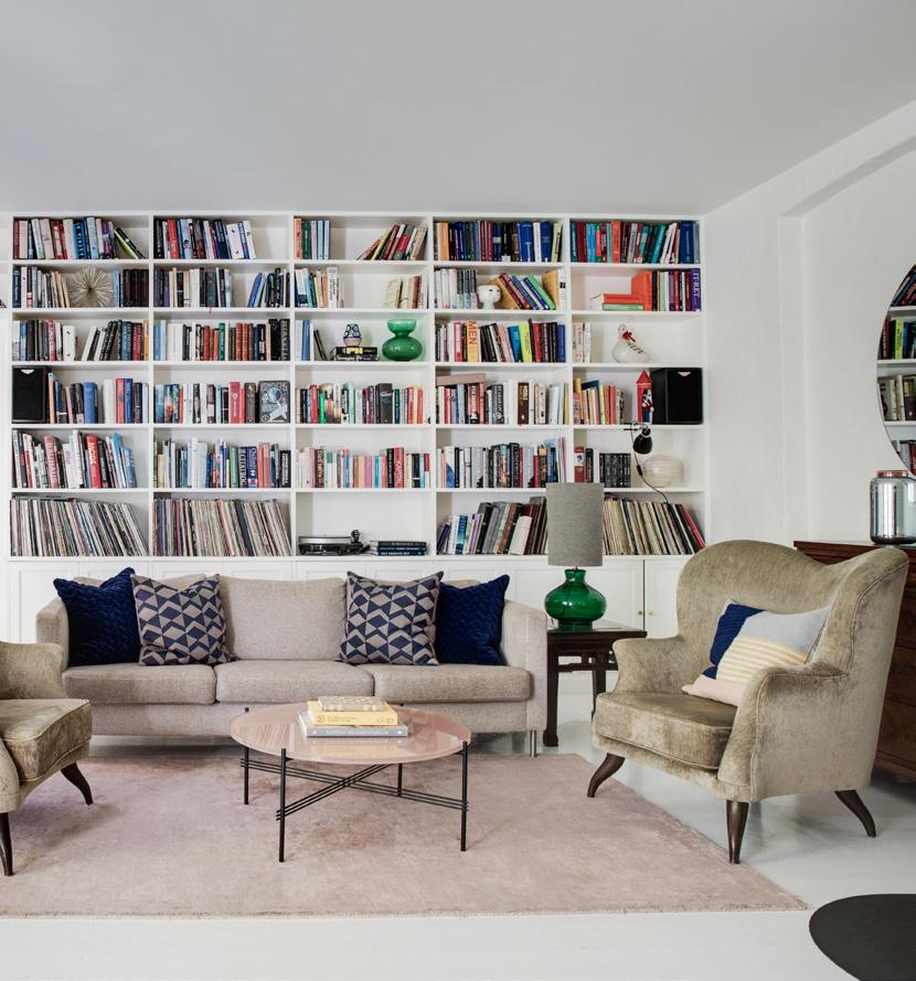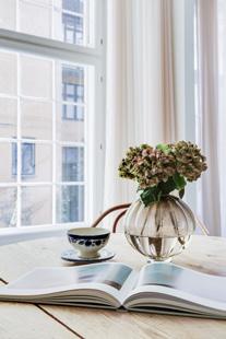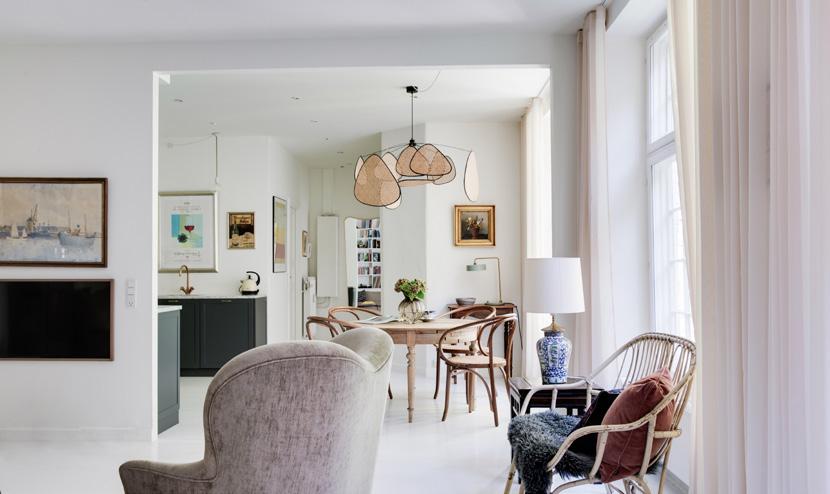 DEN GENERØSE åbning mellem spisestue og stue sikrer en social og luftig atmosfære. Her kan du lade dig henføre af de store vinduer og den franske altan der vender ud til baggården. De garanterer et skønt dagslys og en fortryllende charme. Langs hele væggen pryder bøger i den specialbyggede reol fra JP Snedker.