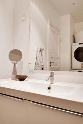 Det store badeværelse er med sit minimalistiske udtryk, den perfekte ramme for morgenrutiner og skønhedsritualer. Her får du blandt andet en dejlig bruseniche, et rummeligt vaskeskab og en vaskesøjle.
