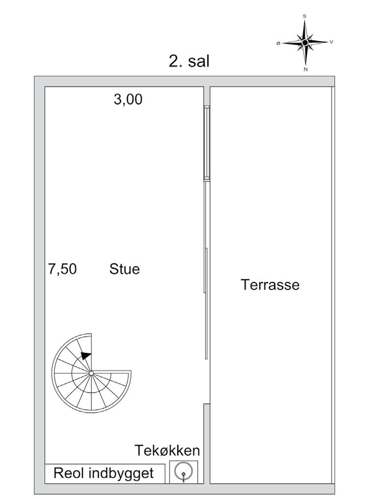 STUEN PÅ andensal er en dejlig og afslappende lounge i penthouse-stil. Her nyder du det fantastiske lysindfald som stråler ind fra gulv- til loftdørene. Rummet oser af urban livsstil og indbyder til en individuel og kreativ indretning. Her kan du underholde gæsterne med både drinks og afternoon tea. Der er nemligen både et barskab og tekøkken i den indbyggede bogreol der går langs med den ene væg.