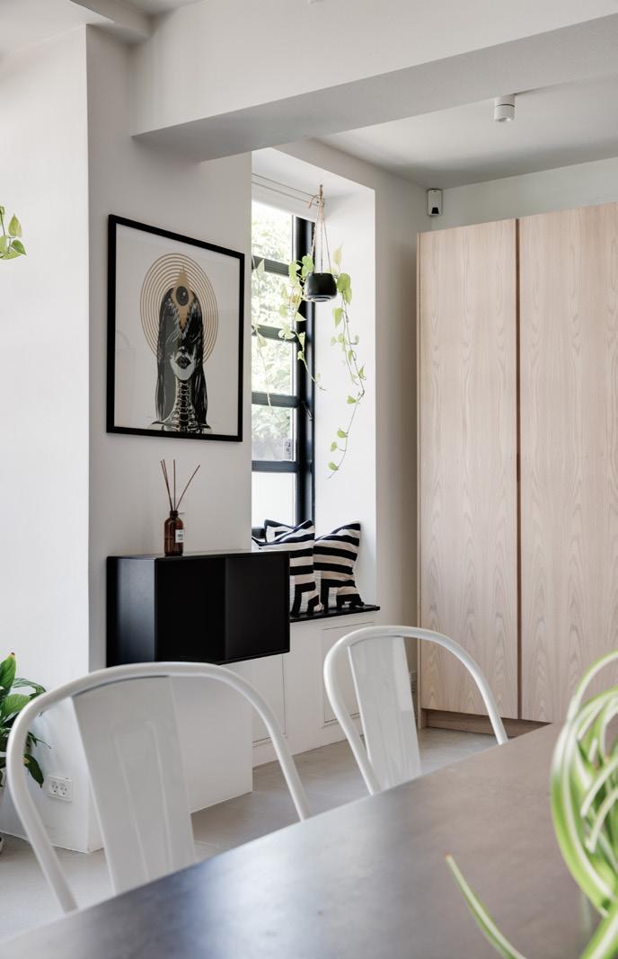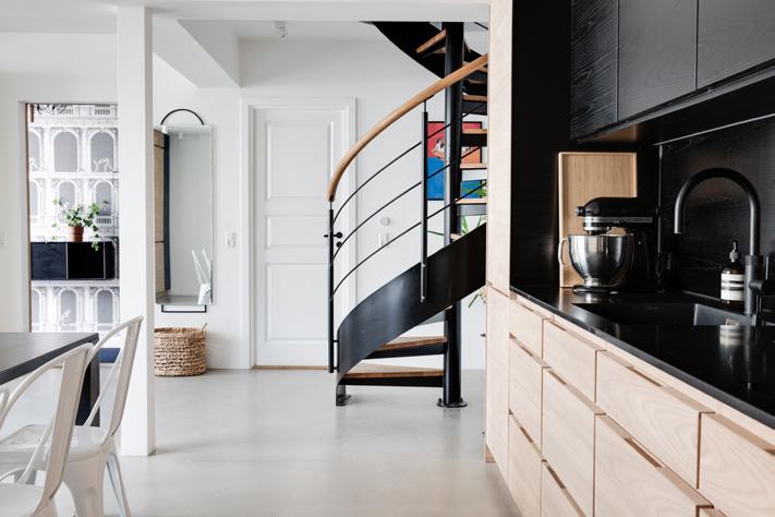 DET URBANE og sociale køkken/alrum komplementerer ejendommens industrielle stil. Her findes et nyt lækkert køkken fra Køkkensnedkeren der bare skriger dansk kvalitet. De dejlige låger i træ, det rå betongulv med gulvvarme, og de sorte store industrivinduer, alt er med til at skabe en helt særlig storby atmosfære. Her findes maskuline detaljer som en sort Quooker vandhane, vin- og baristaskab, samt en specialdesignet spindeltrappe i jern og egetræ.