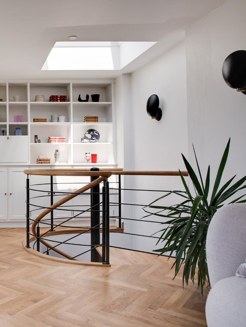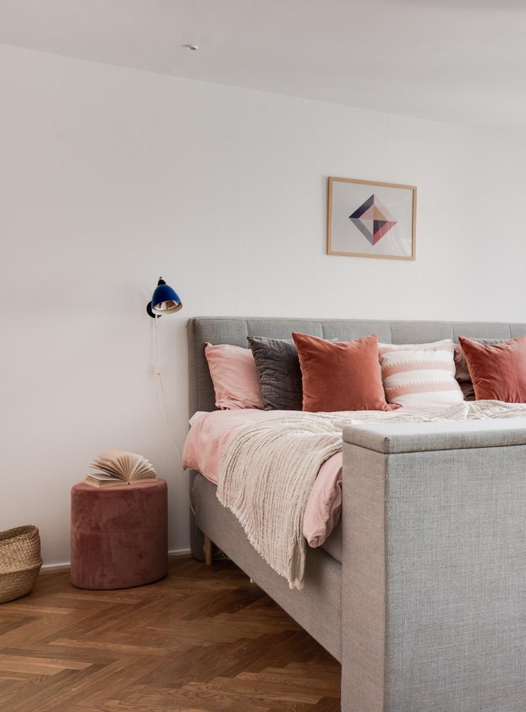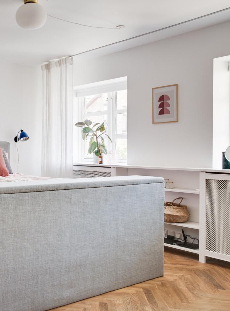 NÅR DU TAGER trappen op til første sal, mærker du spor på at der engang var en filmfabrik i huset. Den eksponerede murstensvæg i mastersoveværelset skaber karaktær og hygge. Det rå look blandet med en romantisk stemning, er med til at skabe en helt særlig atmosfære.
