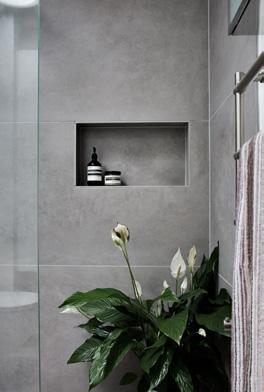 Et spritnyt og lækkert badeværelse med ovenlys, flotte detaljer og en store bruseniche.