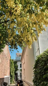 BYHUSET fra 1916 på Sankt Knuds Vej 22, udstråler en særlig charme med sine store industrielle vinduer og hvidpudsede facade. Det er en unik bygning som ligger i hjertet af Frederiksberg, men som samtidigt har en privat og afskærmet placering. I den fælles gårdhave er stemningen hyggelig og indbydende. Her kan man lade hoveddøren stå åben, så både hunden og børnene kan lege frit, imens man holder øje med dem fra køkkenvinduet. På gården er der indgang til ejendommens kælder.