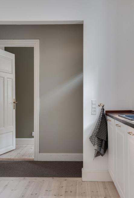 Allerede når du tager det første skridt over dørtærsklen, kan du mærke den vidunderlige stemning i dette eksklusive byhus. I det varme og indbydende entrérum kan du hænge frakken og stille skoene på plads i de indbyggede garderober - en funktionel detalje i et hjem fyldt med historie og charme. Fra gangen kan du ane lyset fra den private gårdhave, som trækker dig længere ind, mens den originale trappe inviterer dig til at gå på opdagelse videre op til første- og andensal.
