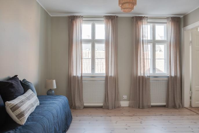 I denne rolige stue er der plads til fordybelse og til at sænke tempoet. Her kan du synke ned i en lænestol med en kop te og nyde udsigten til den stille gårdhave. Lyset falder smukt ind gennem de to vinduer og fremhæver de originale detaljer og de lyse plankegulve.