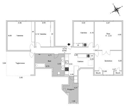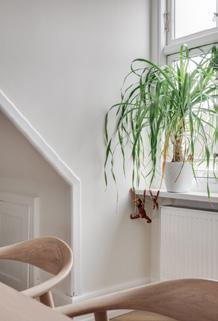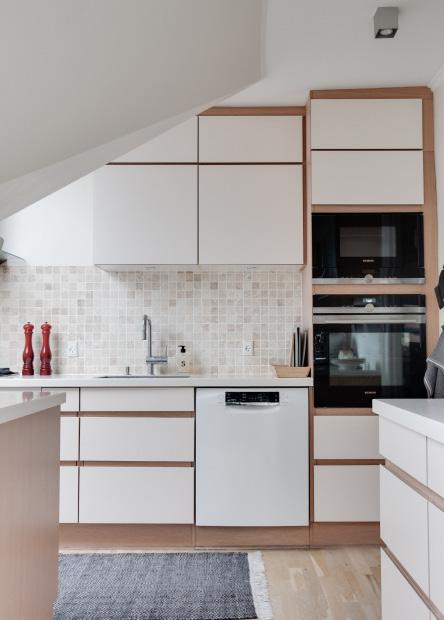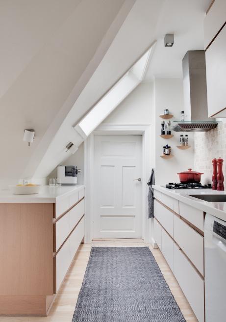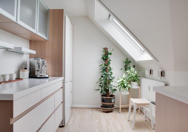 Køkkenet omfavner dig med sin særlige loftkarakter og varme stemning. Her laver I mad under et dejligt blødt lys der kommer fra loftvinduerne, og i skabene findes der godt med opbevaring. Bag døren længst ind, finder du det fine bryggers.