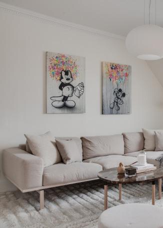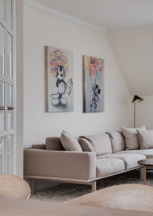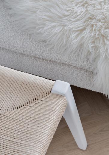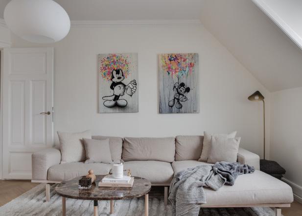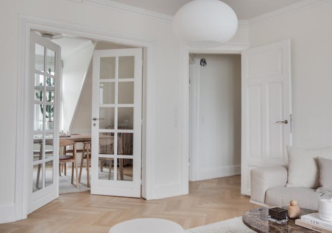 Den lyse og behagelige stue byder på nyt sildebensparket og et skråloft der skaber en hyggelig atmosfære og tilfører rummet karakter og rummelighed. De franske døre åbner op til spisestuen og lader lyset flyde frit mellem rummene, hvilket understreger boligens åbne og harmoniske stemning.