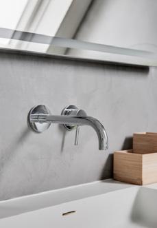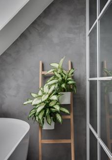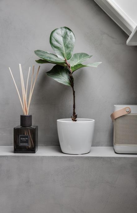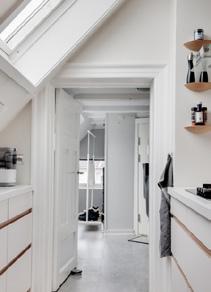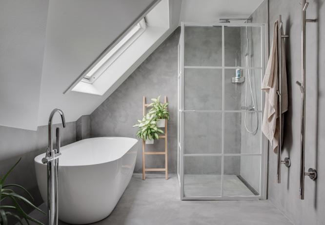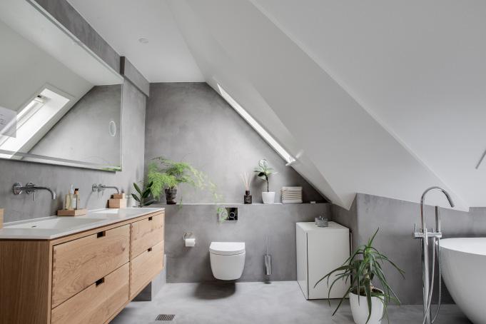 Lejlighedens spritnye badeværelse fra 2024, imponerer med sin unikke form og størrelse. De lækre materialevalg, fulænder den skandinaviske og moderne look. Gulv og vægge er dækket af en blød og mat silkecement, og det doble vaskeskab i træ står i perfekt kontrast til den lysegrå farve. Her kan du nyde enten et bad i badekaret under skråloftet, eller et hurtigt morgenbad i bruseren.