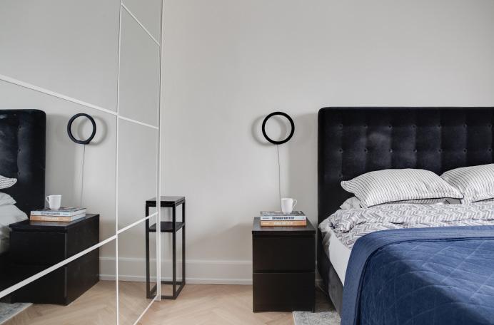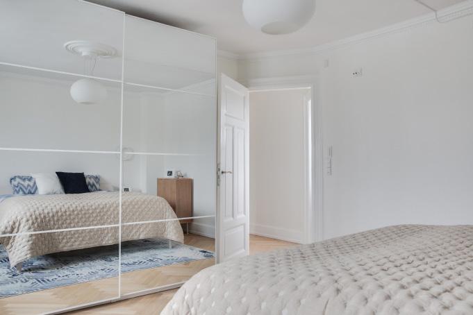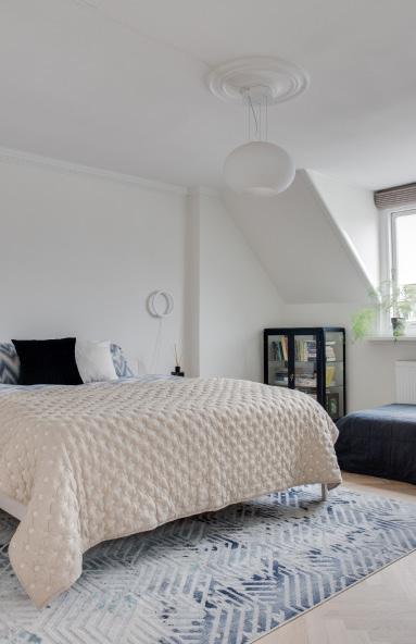 Længst ned ad gangen, ved siden af terrassen, ligger dette rolige drømmesoveværelse. Her kan du slappe af efter hverdagens tempo og afskærme dig fra verden, der er nemlig etableret ekstra lydisolering mod lejligheden nedenunder, og de skræddersyede gardiner, er blackout med motor.