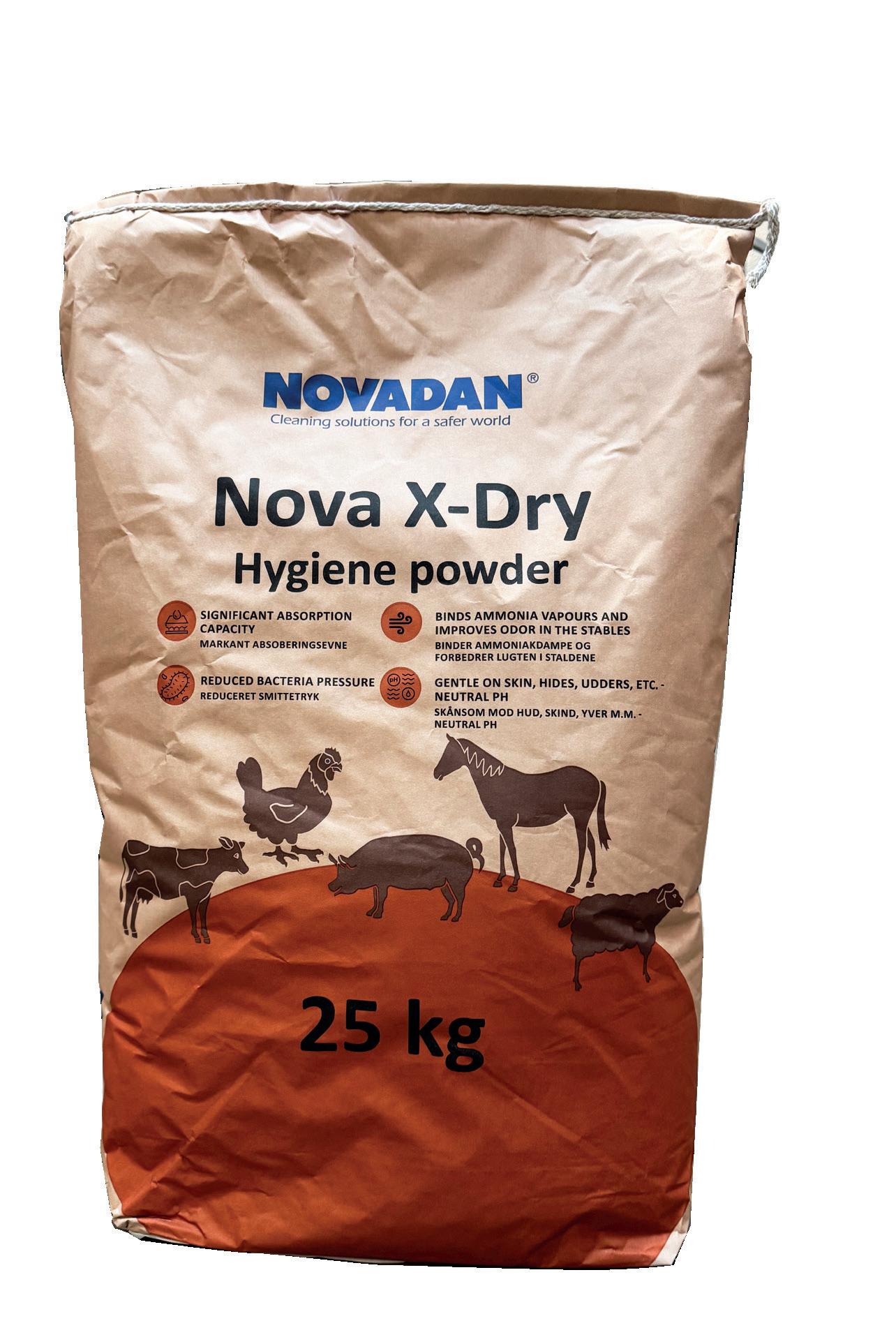 Nova X-Dry jest preparatem w formie proszku służącym do poprawy warunków higienicznych bytowania zwierząt. Przeznaczony do stosowania w budynkach dla bydła, świń, owiec koni oraz drobiu. X-Dry zapewnia doskonałą absorbcję wilgoci, szkodliwych gazów oraz redukcję szkodliwych bakterii w środowisku bytowania zwierząt.