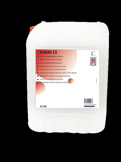 The product also gives a strong foam with good adhesive power which effectively dissolves calcium- and protein deposits. Foam 13 is especially suited for use on all surfaces, including aluminium, brass and copper in the recommended dosage and temperature.