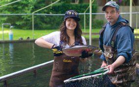 That water is re-used three times: first in the hatchery, then in the tanks, and lastly, in the pond.