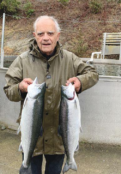 Larry Albright shows off two sockeye salmon weighing between 5-6 lbs harvested in January 2022 PHOTO: RICHARD HENLY FISH FARM