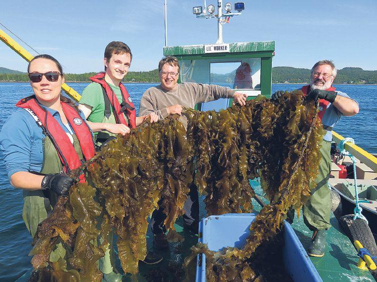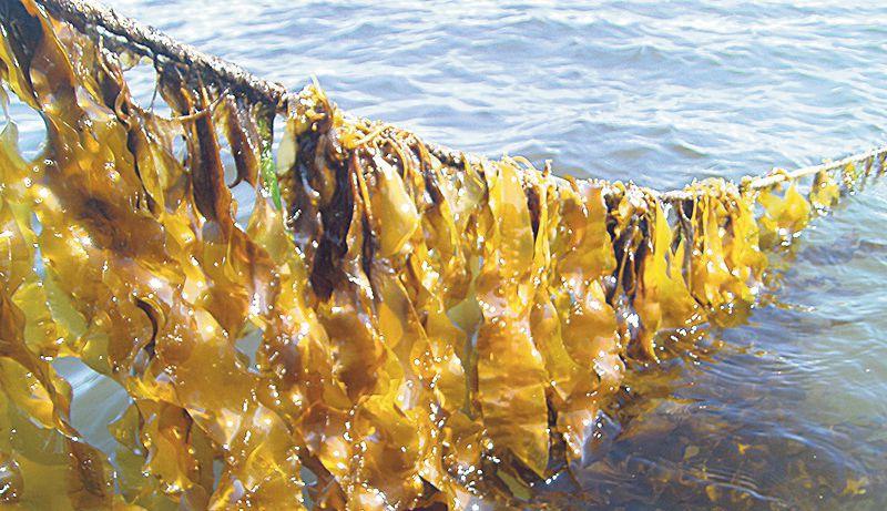 Michael Chambers holds up long length of sugar kelp seaweed grown in the IMTA raft. The kelp is sold locally to restaurants and breweries to make beer