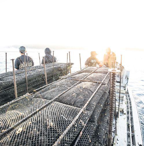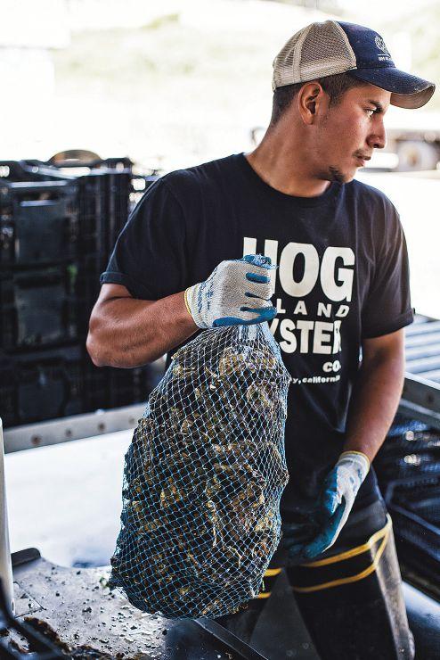 Workers approach racks of oysters. Hog Island Oyster Co was launched in 1983 in Tomales Bay
