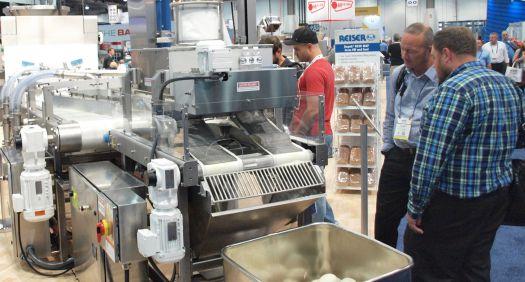Rheon USA was demonstrating and artisanal bread dough forming line which incorporated its two lane punch rounder. The machine was outputting boules at speeds up to 50 pieces per minute. Running a high-speed dough divider on the front corner of its booth, Reiser was showing a multi-lane divider with air chillers designed to keep the dough firm and non-stick without having to dust with flour. The Reiser booth also showed an example of modified atmosphere packaging (MAP) for extending the shelf life of bread.