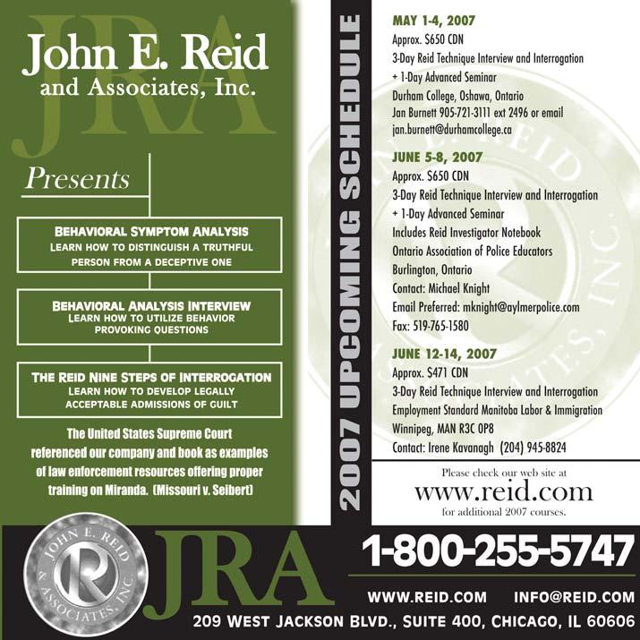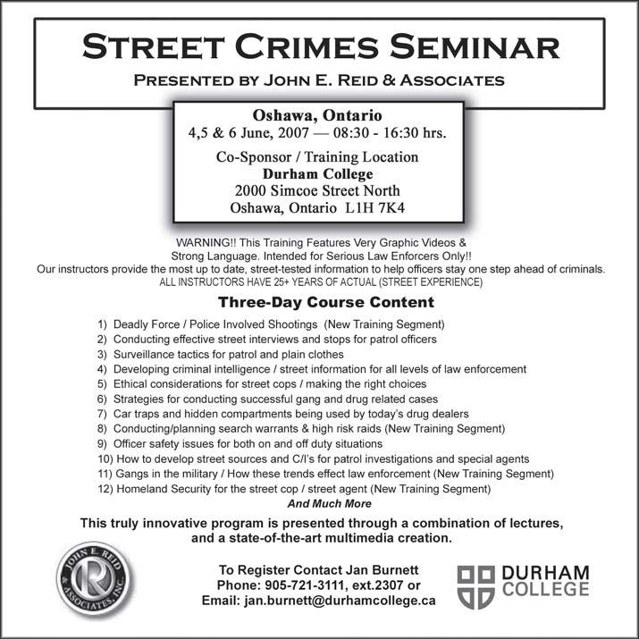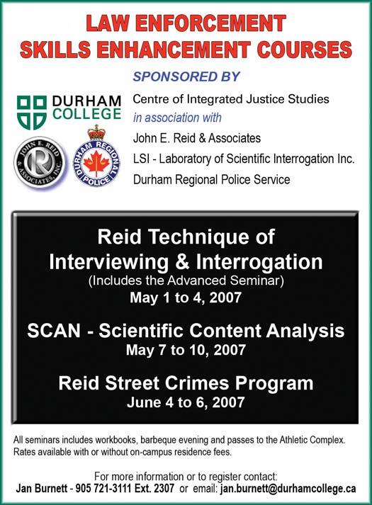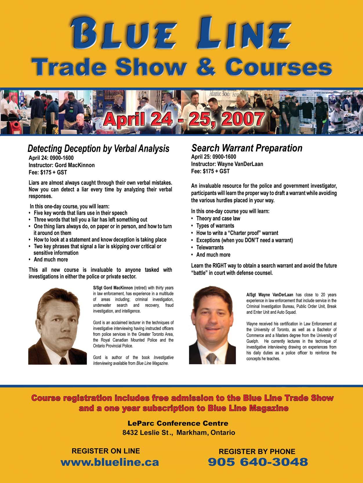 This course by instructor Gordon MacKinnon will teach you how to detect a liar every time by analyzing their verbal responses. This all new course is invaluable to anyone who investigates. This course is offered during the Blue Line Trade Show. See course information page 41. Register at www.blueline.ca or phone 905-640-3048.