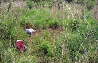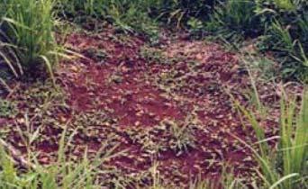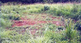 Contrary to our expectations, vegetation did not regenerate over the mass grave for more than 12 months. The control site was approximately 60 per cent re-vegetated five months following burial (Figure 2). At 16 months, vegetation can be seen in the centre of the grave (5x5m), covering approximately 70 per cent of the area, but the rectangular area can still be clearly delineated (Figure 3).