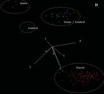 From the airborne imagery (one month following burial), when the spectral signatures (i.e. reflectance data) of the pixels representing the graves (mass and single) are examined, there is also a distinct separation of those pixels from the ones that represent other targets in the scene (e.g. pasture, control site, forest). This indicates the potential application of such imagery to the location of clandestine burials (Figure 4).