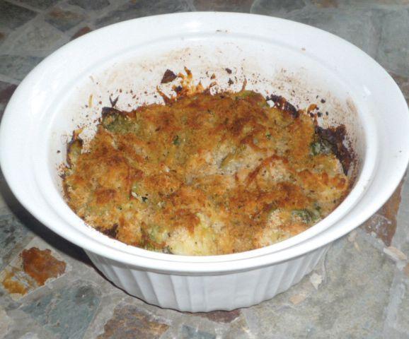 3. Drain the brussels sprouts and halve them lengthwise. Transfer the brussels sprout halves to the prepared baking dish and toss with the red pepper flakes, garlic, shallots, salt and pepper, then spread out evenly. Add the nutmeg to the cream and pour the cream on top. Sprinkle with the cheeses and breadcrumbs and dot with the butter pieces.