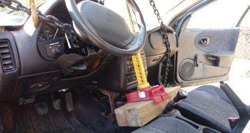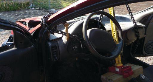 Option 2: Remove the windshield and completely wrap and secure a rescue chain low on the A-pillar near the corner of the dash area (see photo 5). Carefully feed the chain under the steering column and across to the other side of the passenger compartment, through the open passenger door and locate a suitable and secure place to wrap the chain end around, such as the control arm or the vehicle’s frame. Place the FRJ as close to the steering column and the patient as is safely possible. Two 4x4 blocks may have to