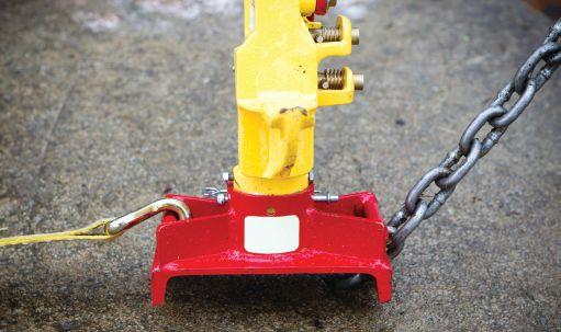 Chris Burdyshaw and Jeff Pugh, firefighters with the Pierce County Fire Department, near Seattle, Wash., and members of the Puyallup Extrication Team (PXT), introduced me to the FRJ. I got to know these two gentlemen while I was judging extrication challenges in the area. During the events, there was always an area cordoned off for a show-and-tell demonstration where firefighters or tool manufactures could teach different techniques and demonstrate new products. Every year, Chris and Jeff would demonstrate the use of a Hi-Lift Jack with yet another improvement from the year before. They were always making homemade modifications to better use this hand tool for extrication work. When Jeff and Chris approached the Hi-Lift Jack Company to inform them of the alterations they had done to the product to make it more useful for vehicle extrications, Hi-Lift listened and the FRJ was born. The product can now be seen at trade shows, on eBay and in extrication classes, and is started to show up on fire apparatusses as standard equipment. One of the unique features of this jack is the base plate: it has a total surface area of 36 inches (90 centimetres), aggressive teeth to dig into soil, mud and pavement, and a chain slot and ratchet strap hook adapter. The width of the plate is seven inches (20 centimetres), allowing it to accommodate two 4x4s to increase support and surface area. The base plate can also be rotated 360 degrees with a removable pin system (see photo 2). The FRJ features florescent colours so users can easily see moving parts in low light conditions. There are three different Jack sizes: 60 inches (200 centimetres), 48 inches (100 centimetres), or 36 inches (90 centimetres).