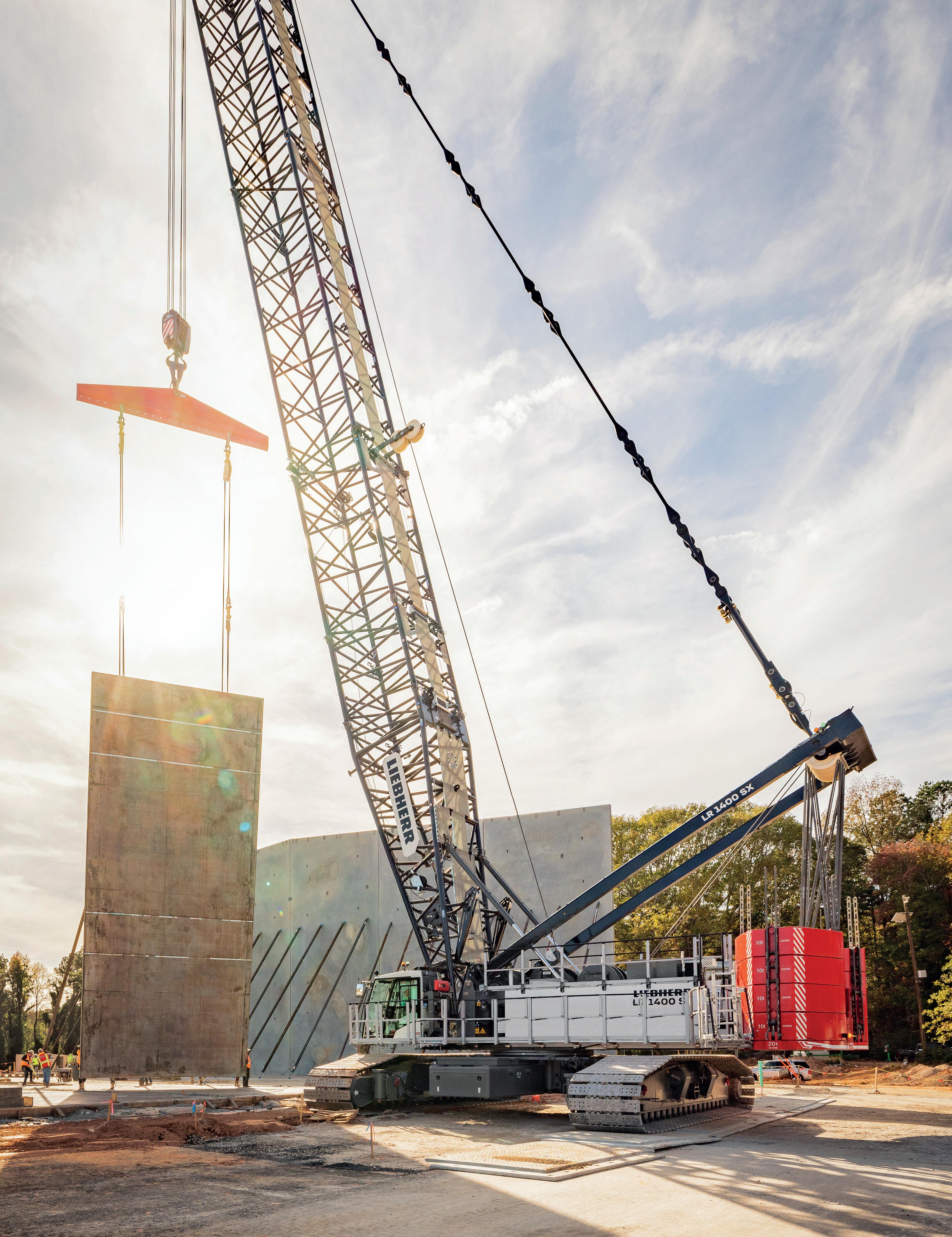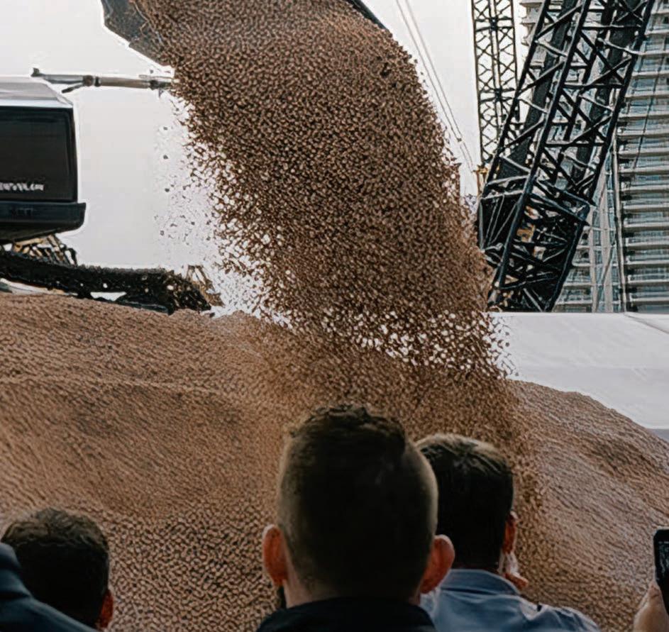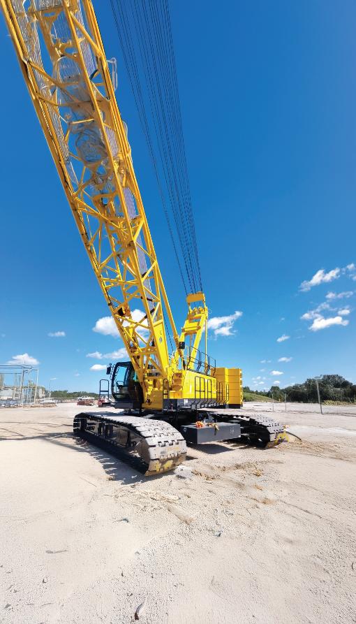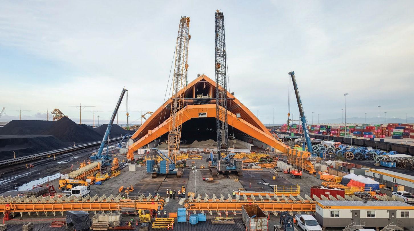 into a mixed-use facility that, once completed in 2026, will enable annual potash exports of 4.5 million tons. According to Sarens this expansion, with an investment of over USD one billion and derived from an agreement with BHP to provide port services to the Jansen mine in Saskatchewan, includes the construction of covered storage areas, wagon unloaders, and conveyor systems. To execute the project, Sarens performed the lifting of 33 double arches composed of glulam arches, beams, purlins, support towers, and concrete anchor blocks, each with a 70-foot radius and weighing 80,000 lb. Sarens’ engineering team conducted a thorough site and lift assessment, selecting a combination of 250-ton crawler cranes, 100-ton RT cranes, 250- and 120-ton all-terrain cranes, and a 55-ton truck crane, optimized for capacity, reach, and mobility.