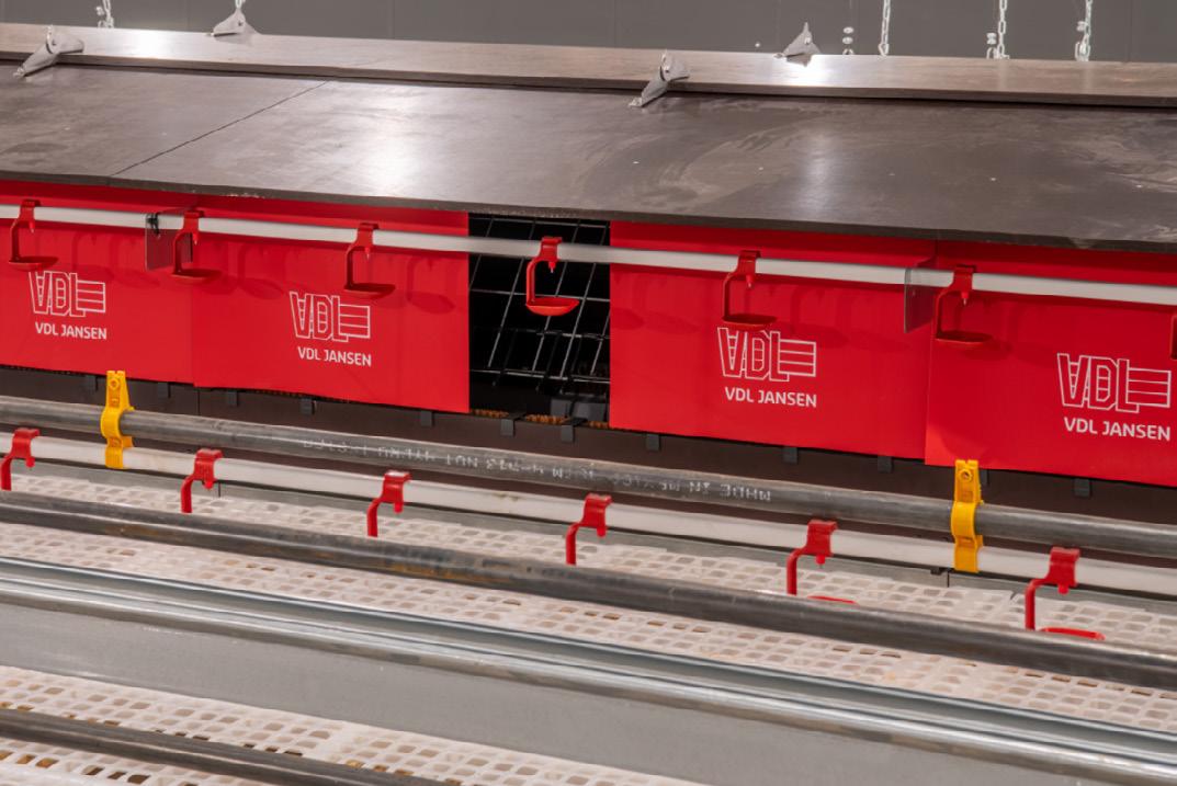 The nest systems of VDL Jansen are long proven in the market, and known for their nest acceptance and egg quality. Our nest is designed to stimulate natural behavior of the hens and have them produce a maximum number of high quality eggs. Available nest area can be optimized by using single or double-tiered nest boxes, whereas a flat roof facilitates for some extra useable area to achieve an optimum bird density in the barn. Our perch frames provide sufficient space for placement of extra perch and feed trough length in the barn. As the perch frames can be winched during clean out, cleaning is easy and more efficient.