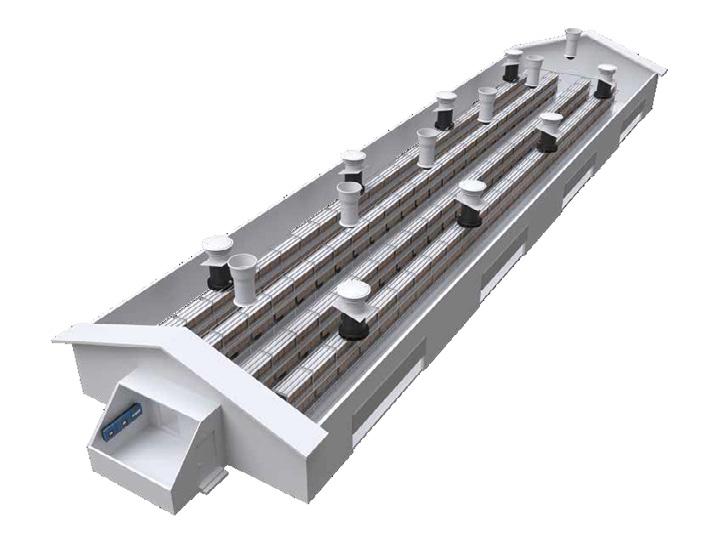 In an equal pressure system, the fresh air is supplied through the roof inlets, and the exhaust air is achieved through high efficiency chimney fans, ensuring a neutral pressure. The roof inlets can also be equipped with recirculation units to ensure fresh air is mixed with stale barn air.