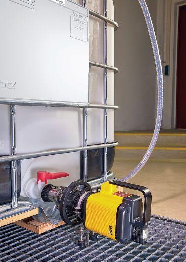 The Horizontal Container Pump Lutz B200 features a centrifugal pump with axial impeller in a compact design. It is directly connected to the bottom outlet valve of the IBC with a standard union nut (S60 x 6). Additional features include a variable drive concept (different universal and air-driven motors); easy disassembly; no suction line necessary, so it has a significantly lower product release when disconnecting; explosionproof versions; and significantly better hydraulic capacity in comparison to a hydrostatic outlet. The pumps have a quantity up to 64 gpm; delivery head up to 50 ft.; spec. gravity up to 2.8; and viscosity up to 650 cps. This very compact pump is a great alternative when containers are stored on top of each other. Lutz B200 is directly connected to the bottom outlet valve. Lutz Pumps www.lutzpumps.com