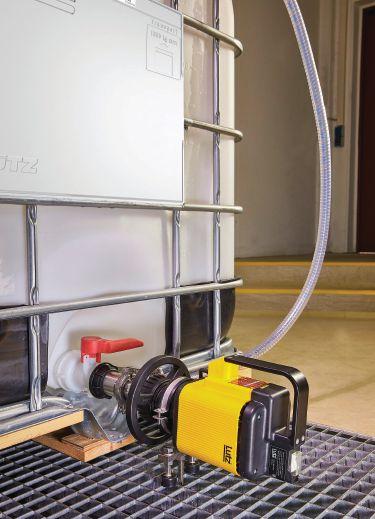 The Lutz B200 Horizontal Container Pump is designed to pump liquid out of stacked containers and containers that are not accessible from the top. Due to the pump’s compact construction, emptying at limited room height is possible. It is available with quantities up to 20 gpm; delivery head up to 262 ft.; and viscosity up to 100,000 cps. The housing material is comprised of 316Ti/316L stainless steel. The pump features a centrifugal pump with axial impeller in a compact design. It directly connects to the bottom outlet vale of the IBC with a standard union nut (S60 x 6). The pump has a variable drive concept (different universal and air-driven motors); is easy to disassemble; and no suction line is necessary, so there is significantly lower product release when disconnecting. Explosion-proof versions are available.