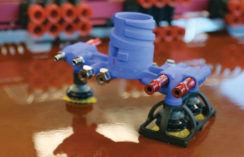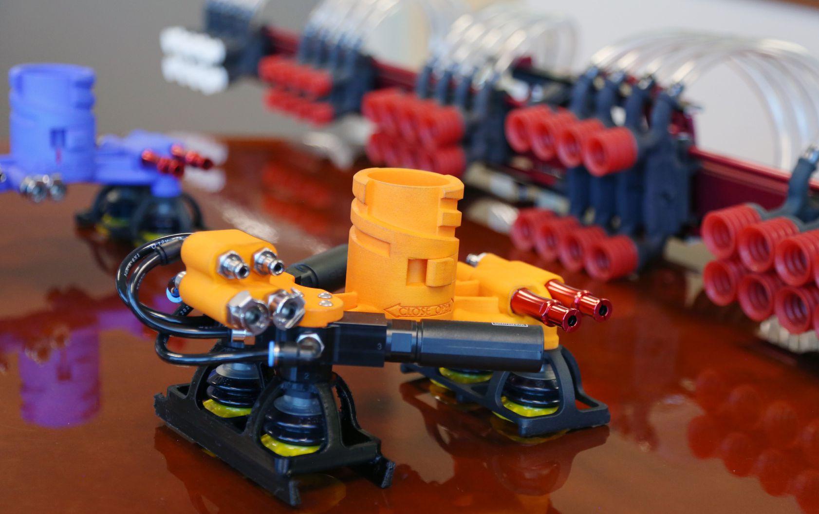 A close-up of a vacuum suction hose assembly made by an in-house 3D printer.