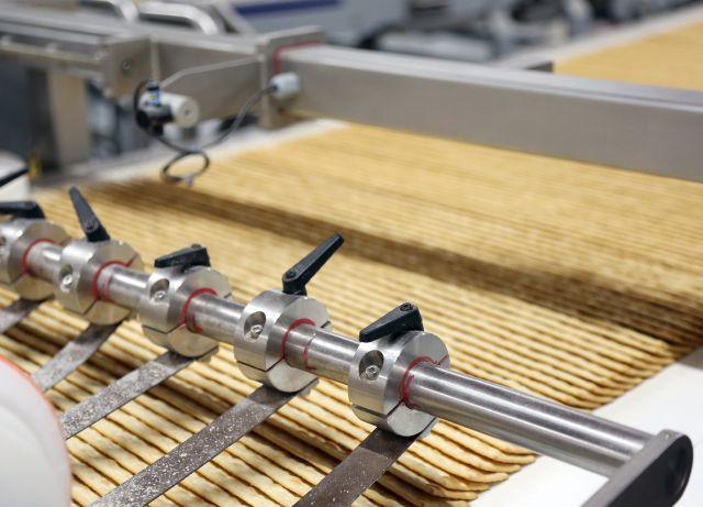 After the products are baked in the oven, cooled down and fed into the FGMT by vibratory channels, one sword moves into the product flow, while the second sword holds the leading edge of the formed slug.