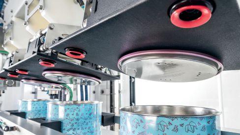 3D-printed robot tooling is used to place the lids onto the tins in an angled orientation in order to ensure a secure seal.