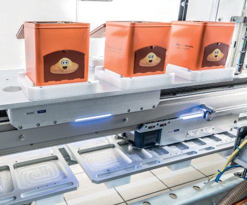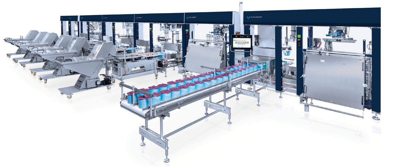 With Schubert’s modular solution, six four-axis pick-and-place robots pick up the products individually from the scanner belt and directly fill the tins or cartons.