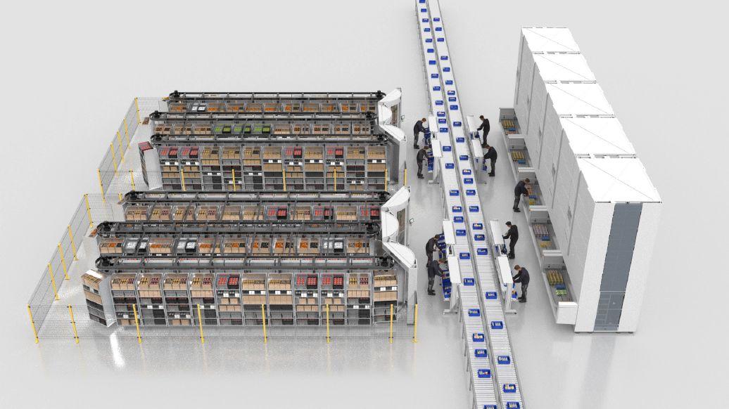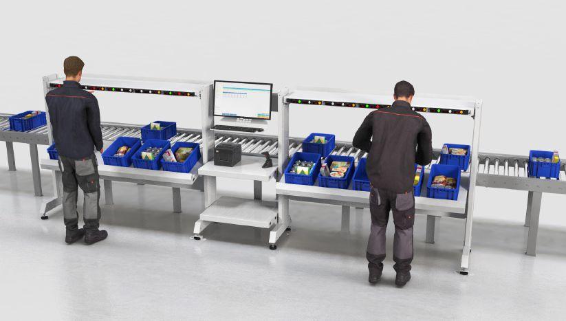 Each of the six stations is responsible for one product and has a 2D scanner to check the orientation.