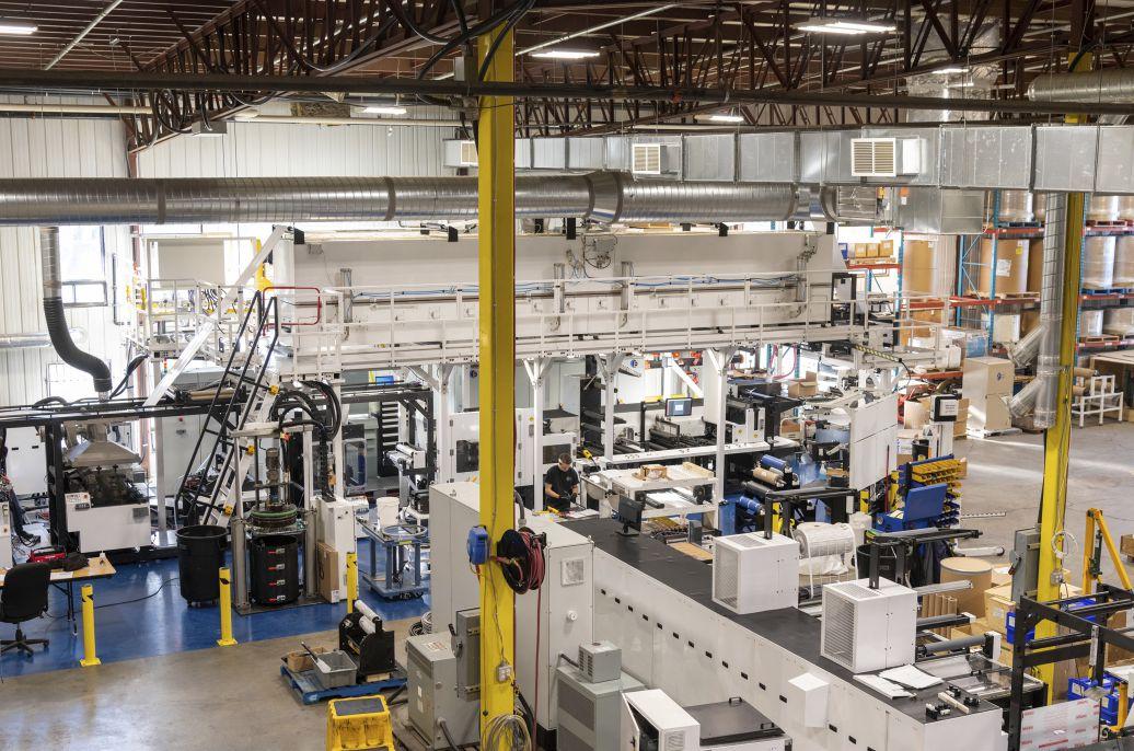 A bird’s-eye view of the ETI plant’s production floor, with a nearly assembled machine for a U.S. customer in the foreground.