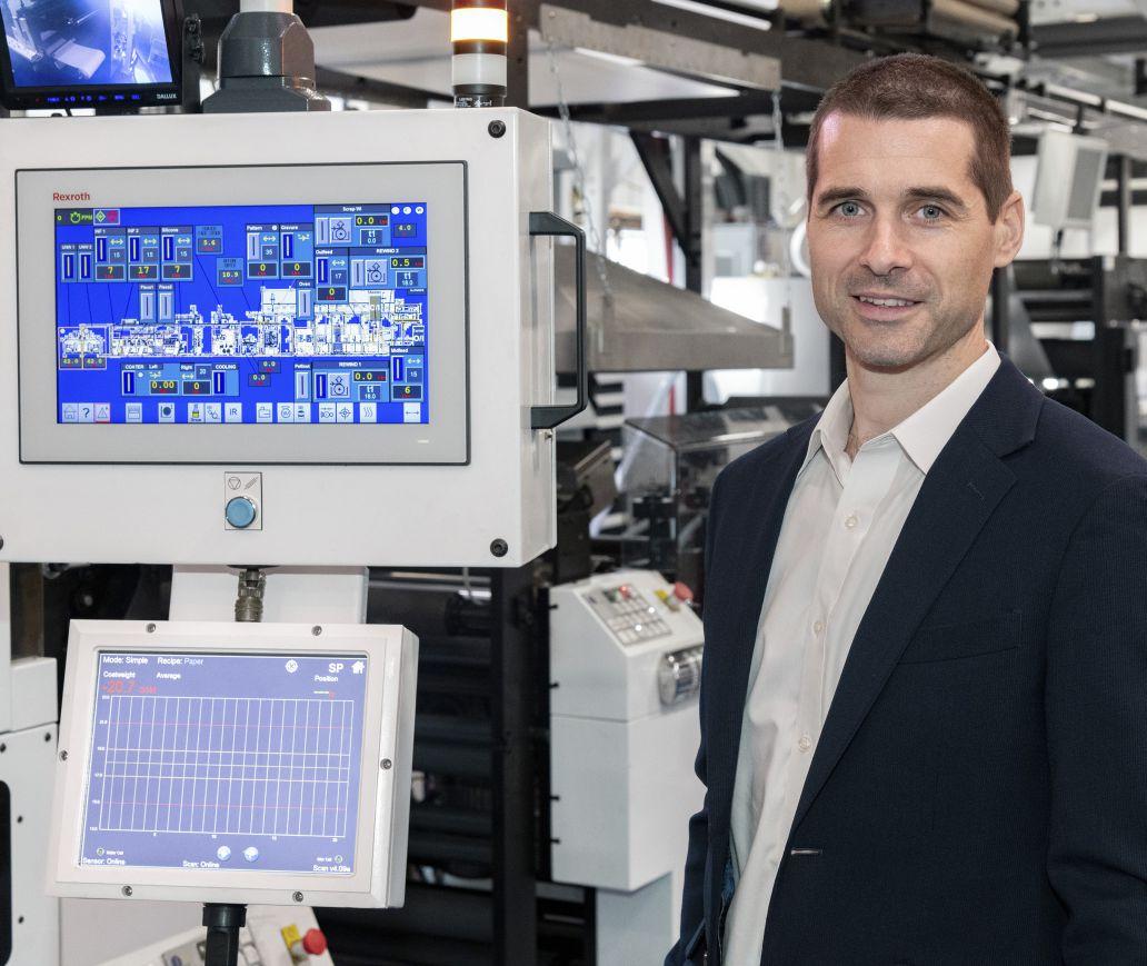 ETI Converting Equipment president Maxime Bayzelon standing next to the touchscreen Bosch Rexroth HMI panel displaying all the critical operating data of an ETI machine located inside the plant’s Technology Centre.
