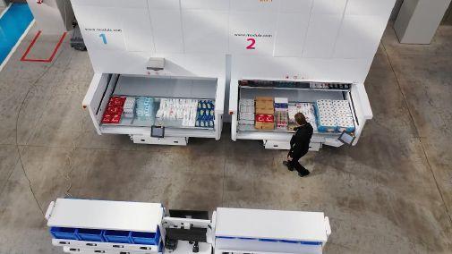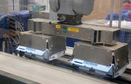 Pick-and-place robots place the packages onto Transmoduls. The transport robots are designed so that all carton and tin formats can be picked up regardless of their geometry.