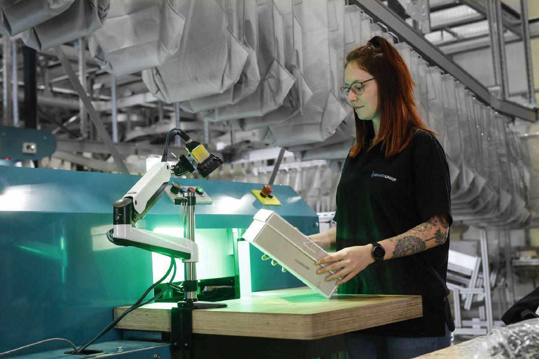 Pre-printed Z-flute board cartons being formed from blanks inside the Syntegon TTM toploader.