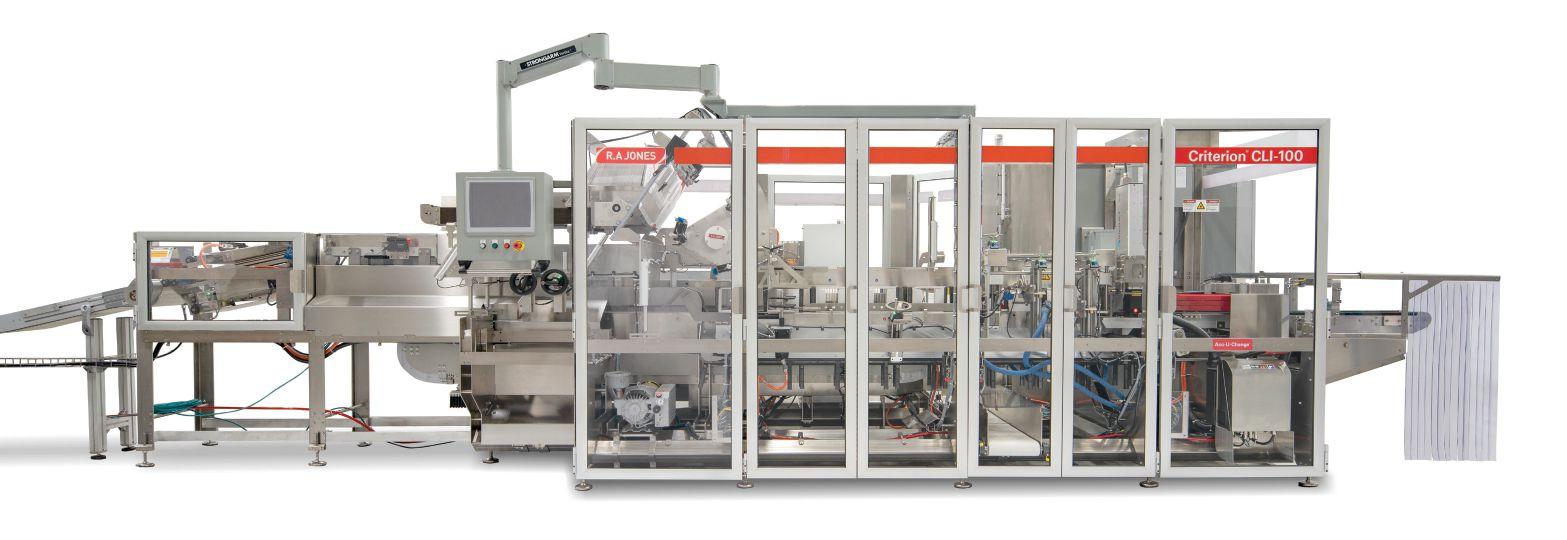 The iFTS product transfer system from R.A. Jones integrated with the Criterion CLI-100 intermittent-motion cartoning machine provides a wide range of new manufacturing and packaging applications with bag, bottles, cans, boxes and other types of packaging containers.