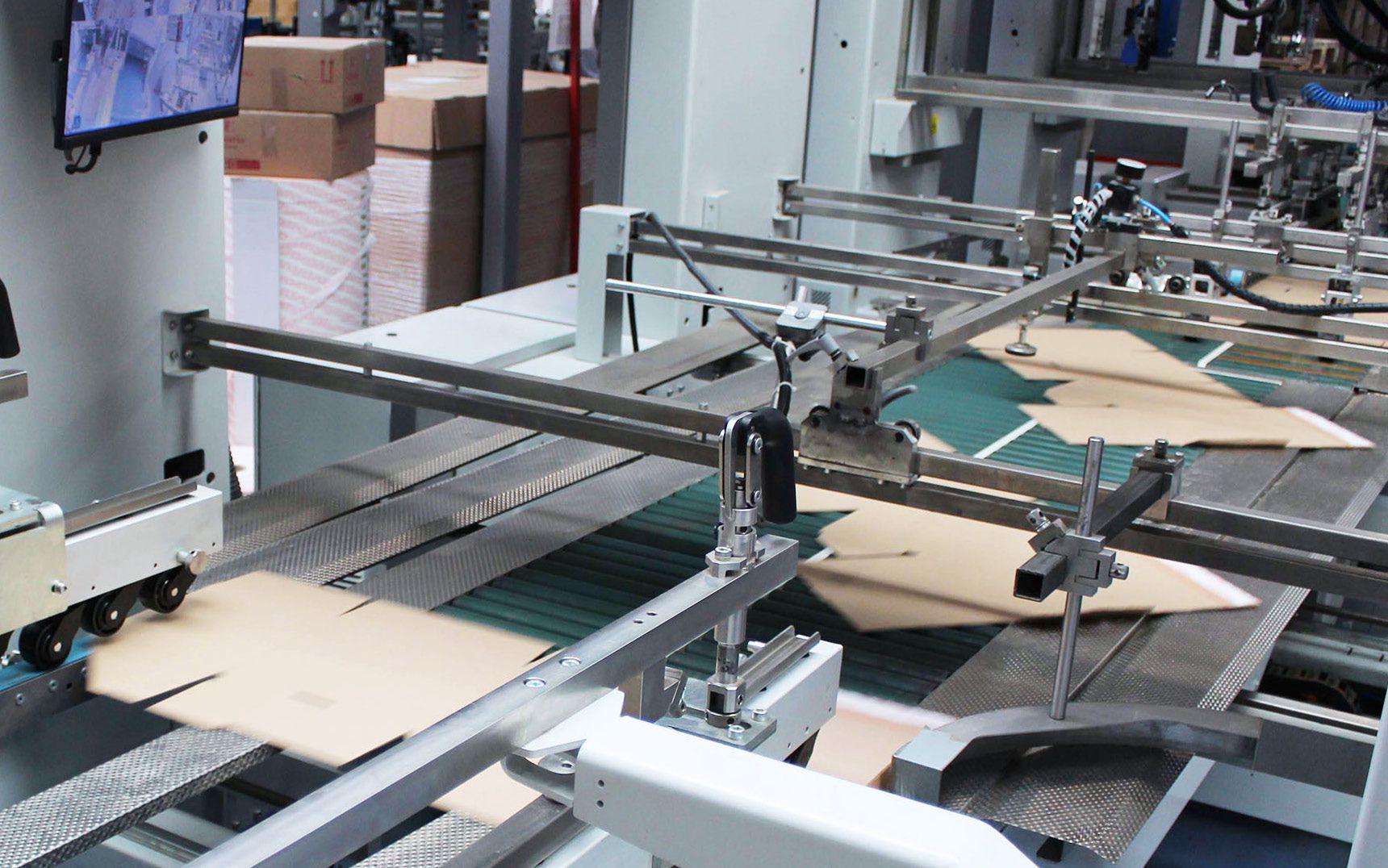 For quality assurance, the individual machine modules are equipped with sensors, which measure the lengths of the boxes and stop the machine if any deviations from the specified parameters are detected.